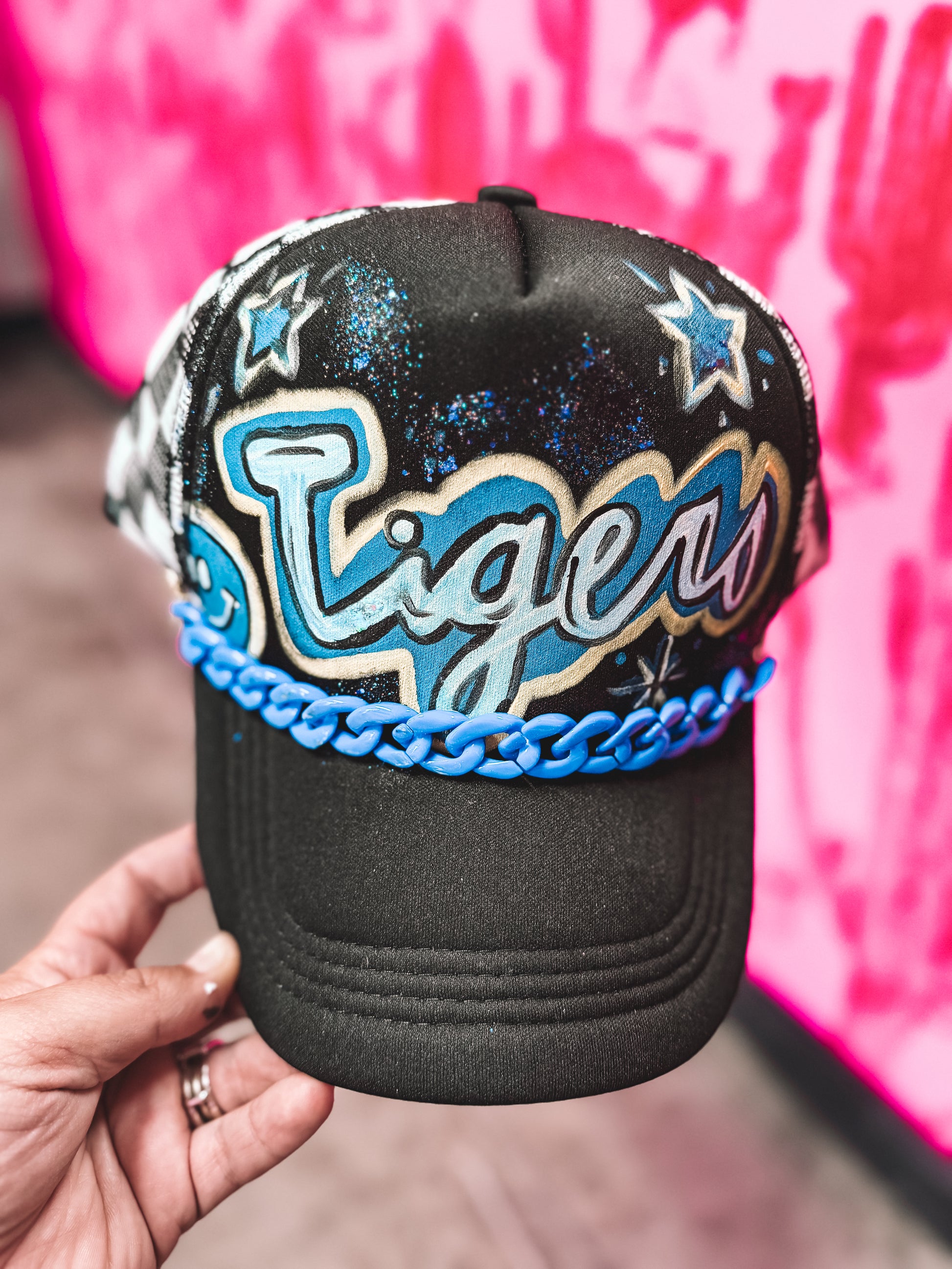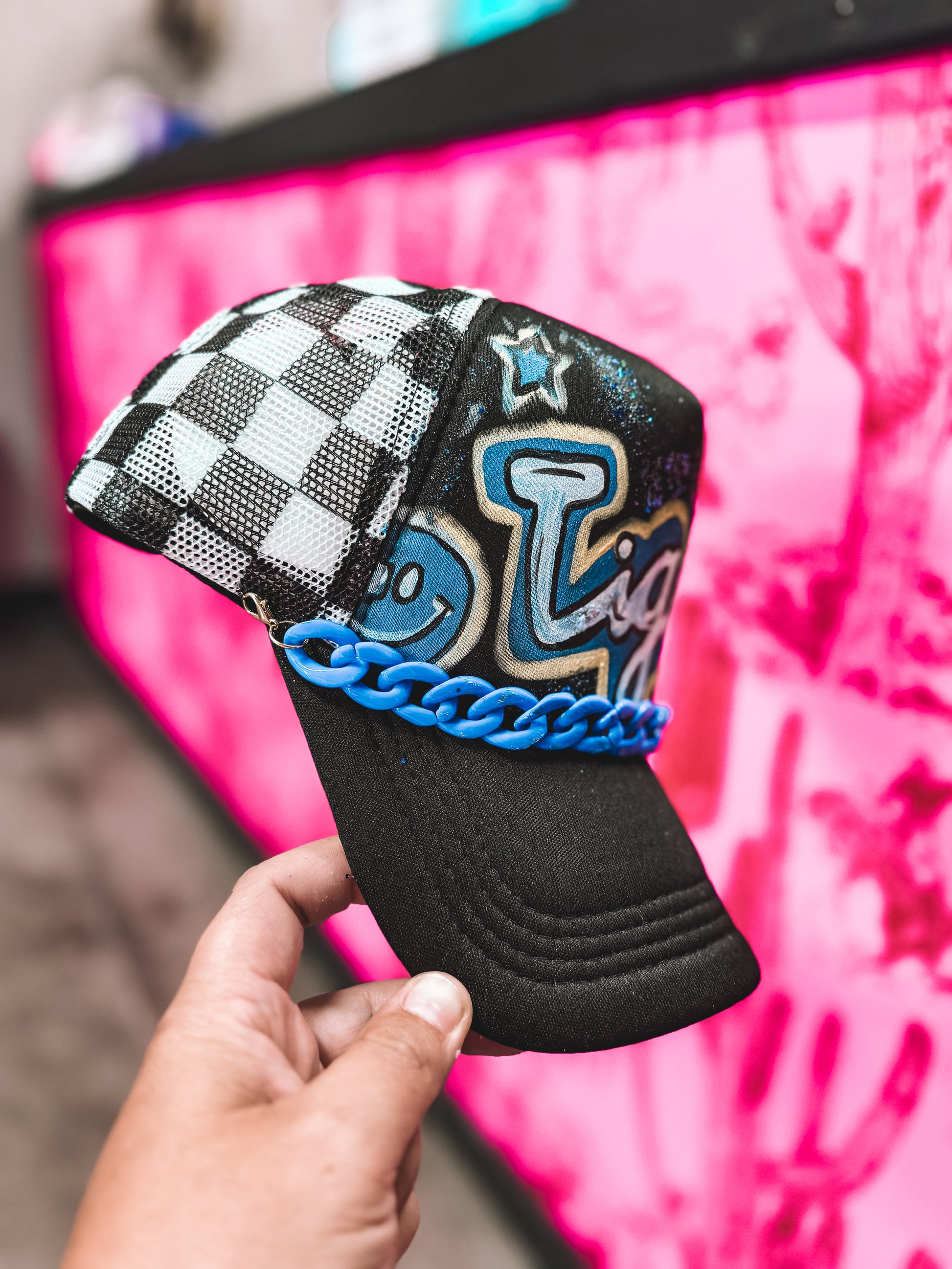 This one of a kind tigers trucker is perfect for game days or when you just don’t feel like fixing your hair. Black and white checkered mesh back added detail!